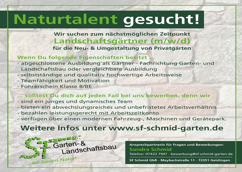 Wir sind seit 2011 anerkannter Ausbildungsbetrieb in diesem Bereich und können dir das Fachwissen und die kleinen Tipps und Tricks des Landschaftsbaus vermitteln! Eigenverantwortung, ein tolles Team und natürlich auch eine angemessene Entlohnung sind bei uns garantiert! Wenn du Teil unseres Teams werden möchtest, bewirb dich einfach direkt über das Online-Bewerbungsformular und erzähl uns, warum du zu uns passt! Wir freuen uns auf dich!